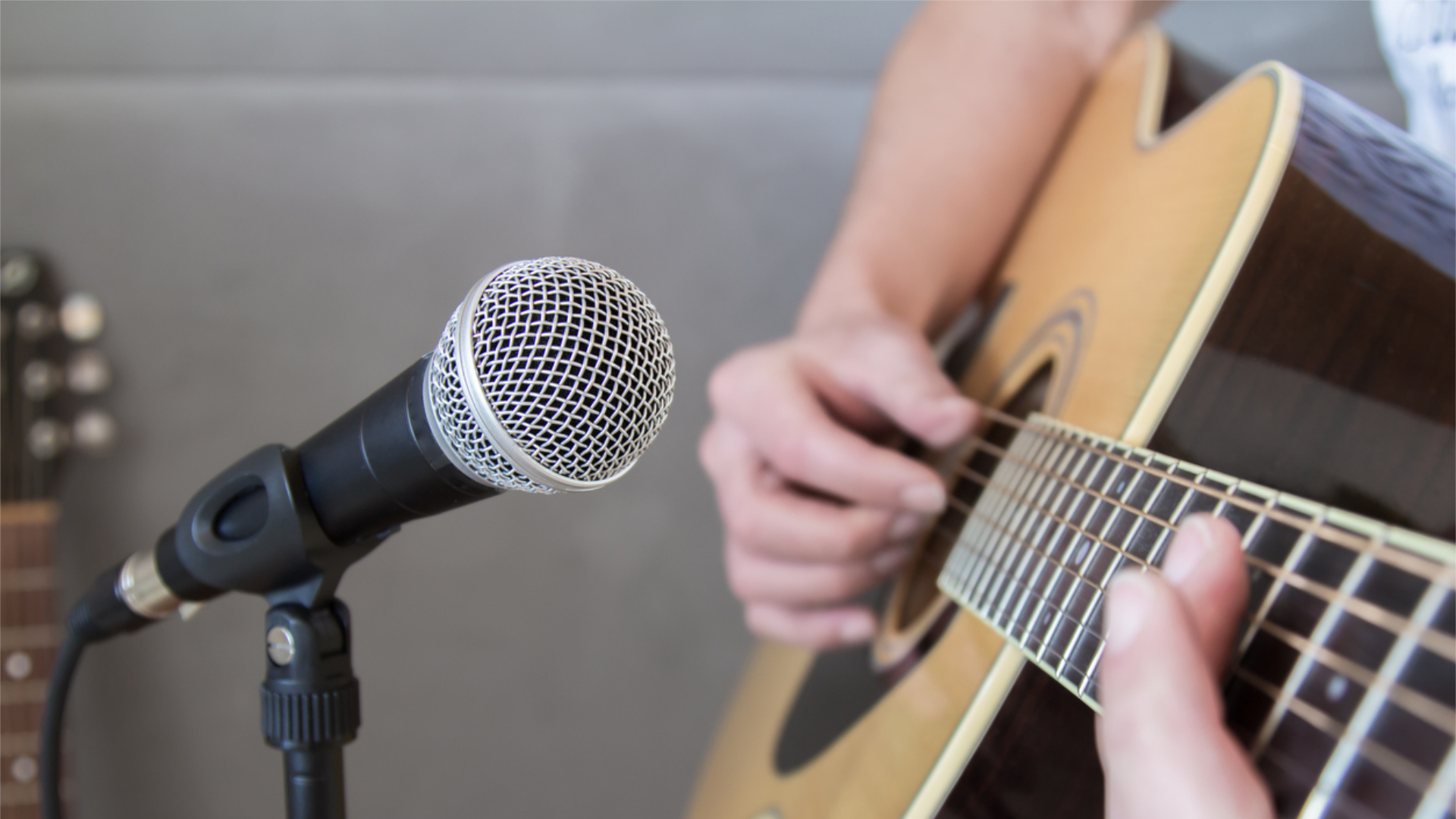 Совет: для записи акустической гитары попробуйте расположить микрофон на уровне 12-го лада, на расстоянии 20–30 см. Это даст сбалансированный звук без излишнего баса.