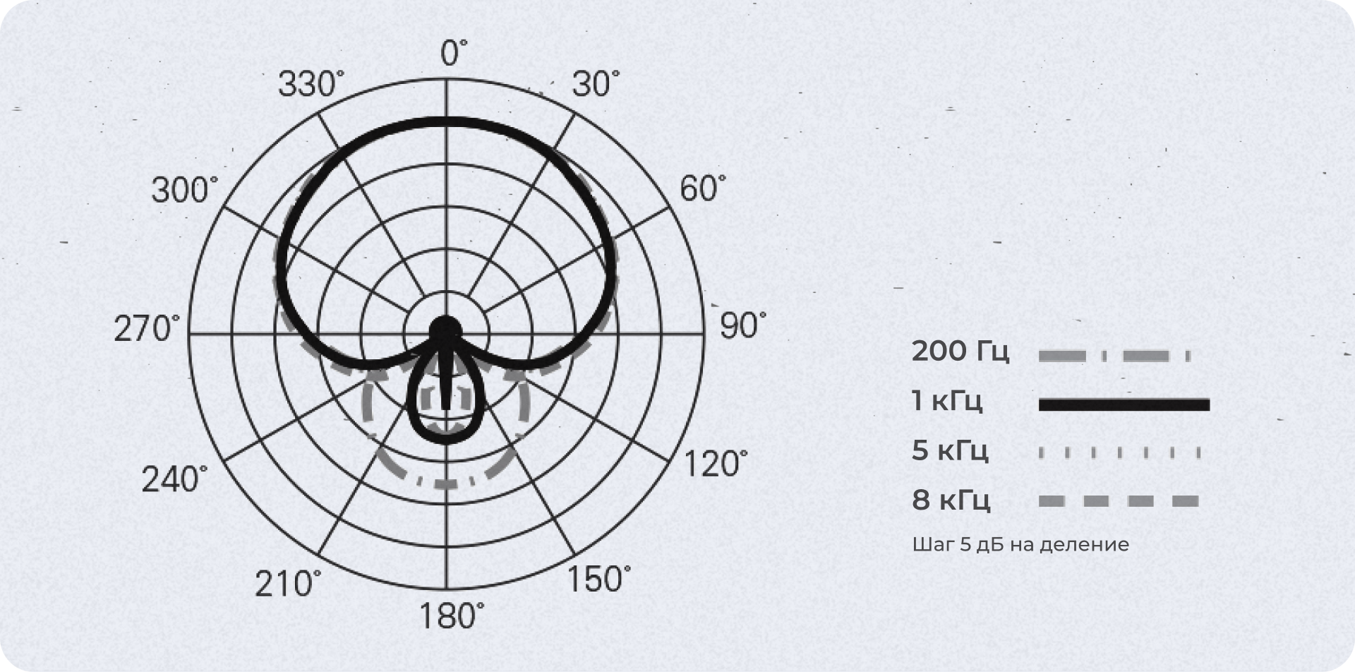 - Как работает: Захватывает звук спереди и сзади, полностью блокируя боковые шумы (нулевые точки — 90° и 270°).