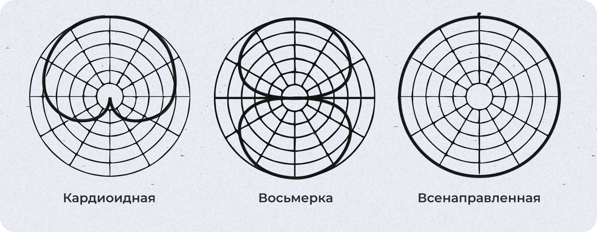 Диаграмма направленности (или полярная диаграмма) — это визуальное представление того, с каких направлений микрофон улавливает звук. Она показывает, какие звуки будут записаны чётко, а какие — ослаблены или полностью подавлены.