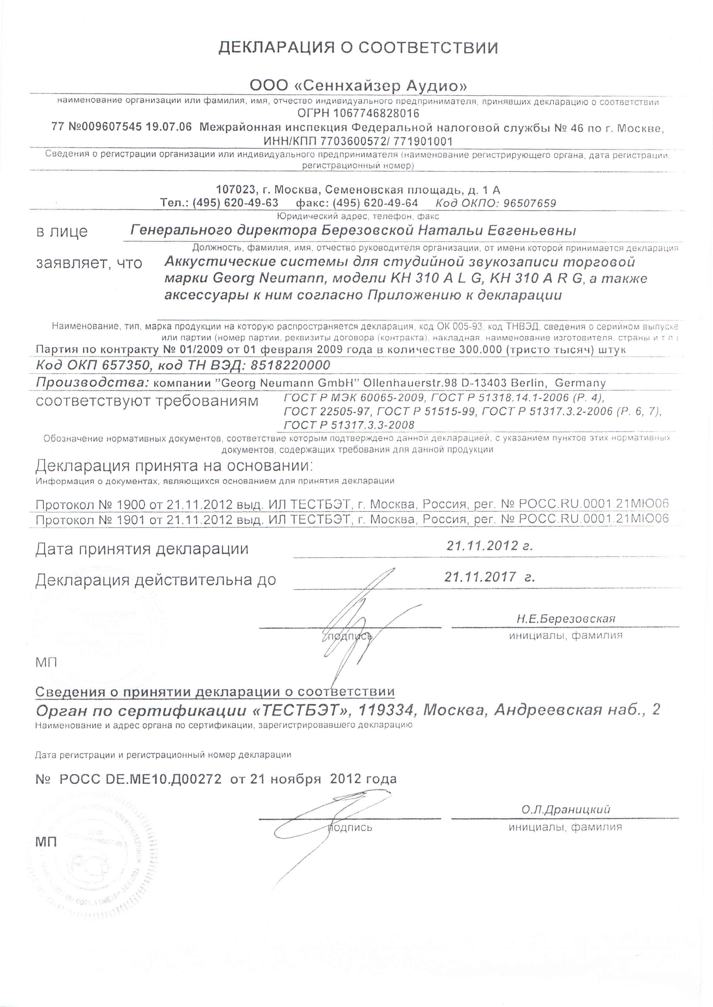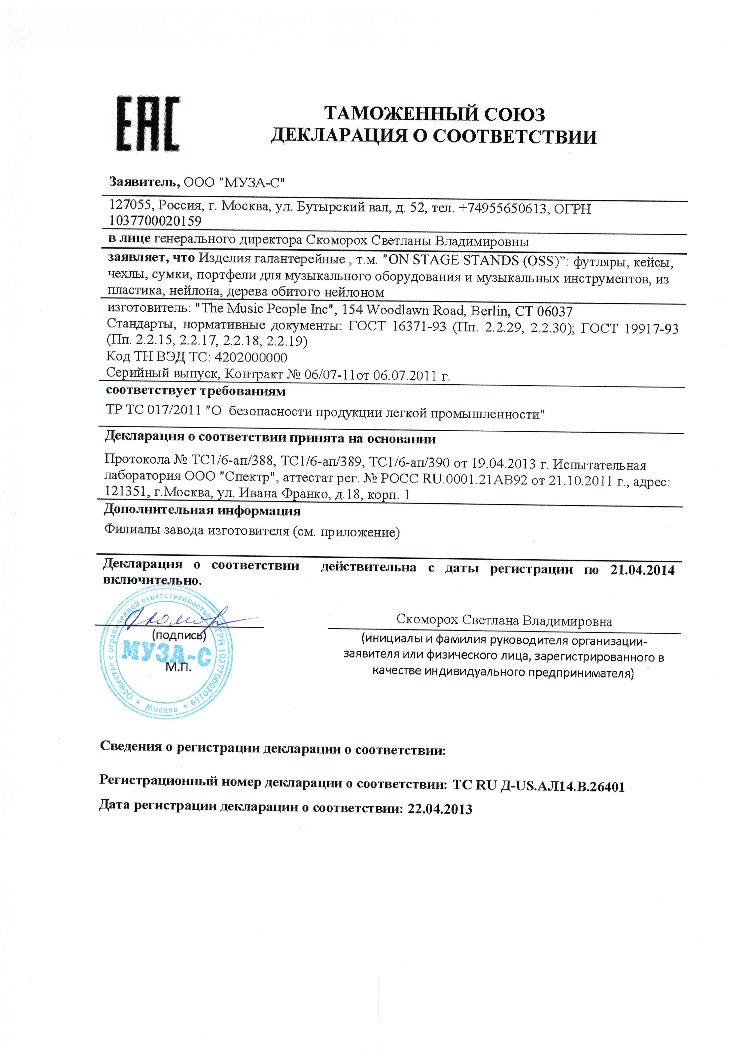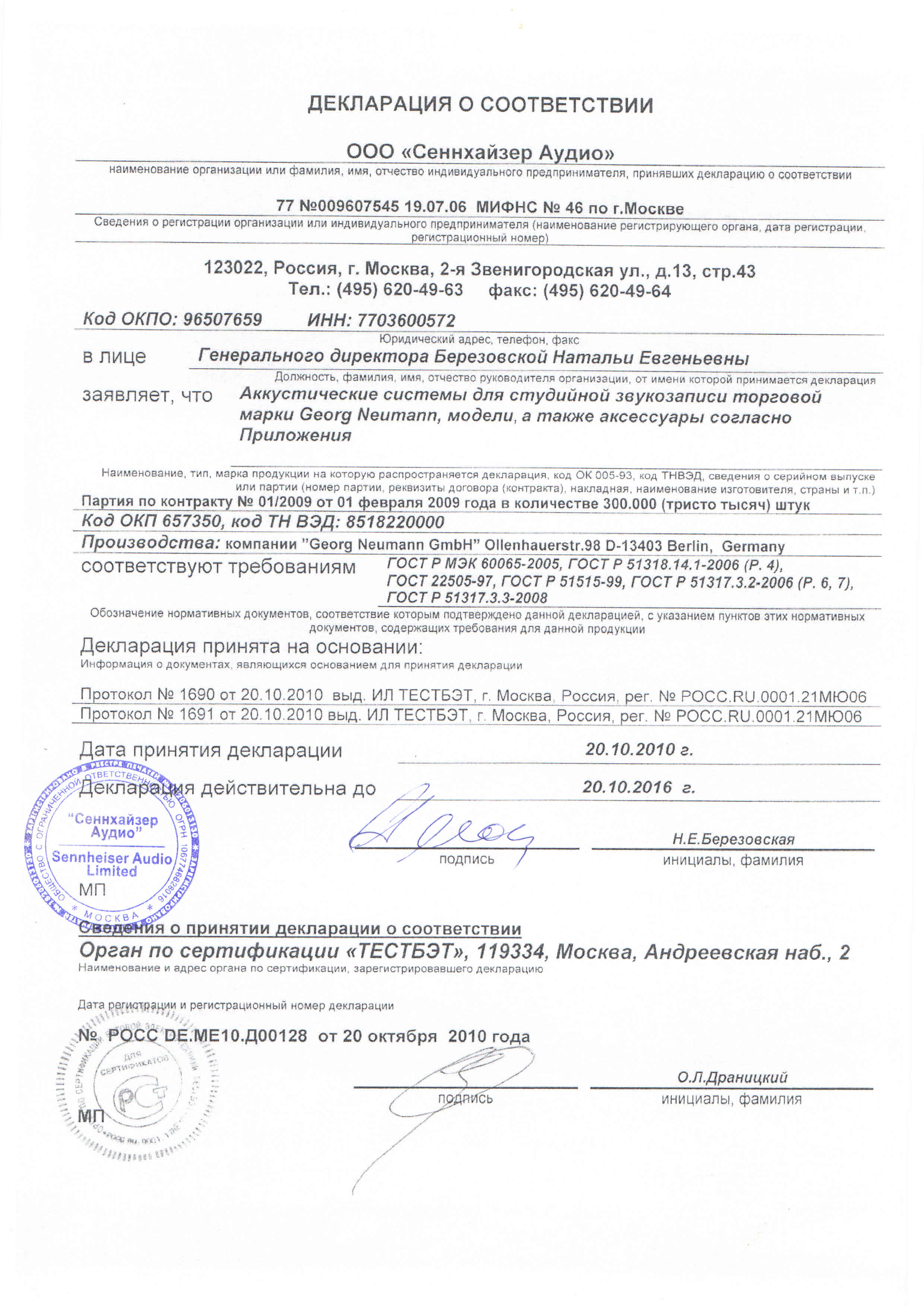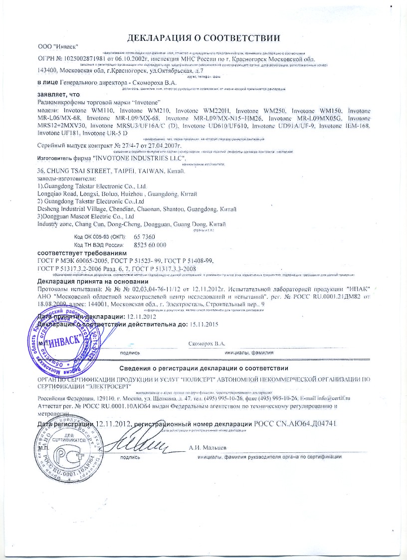 - Декларация соответствия на микрофоны, наушники, радиосистемы, стойки, кейсы, антенны и т.д. (до 18.06.2017 г.) (стр.1) (стр.2)