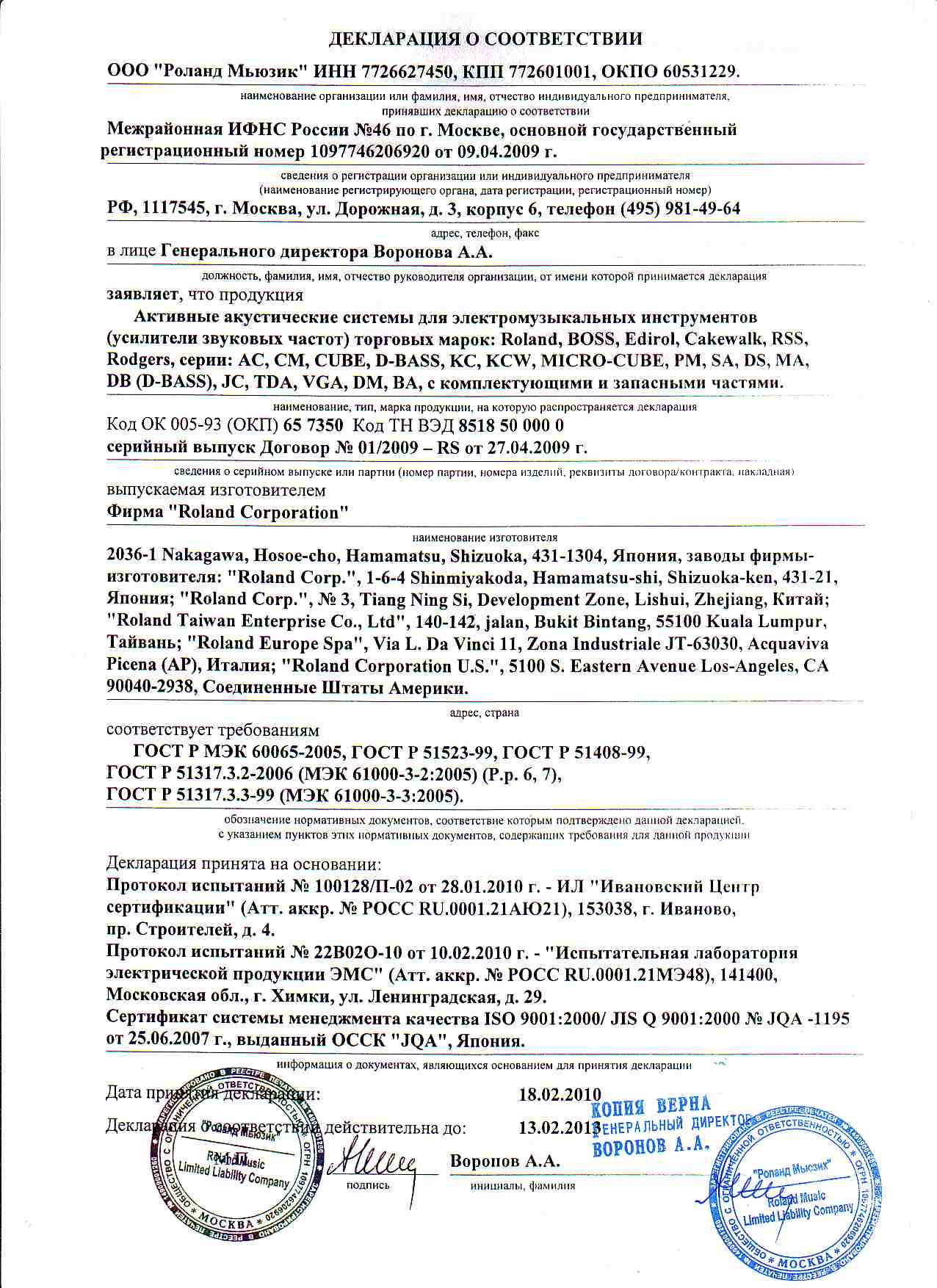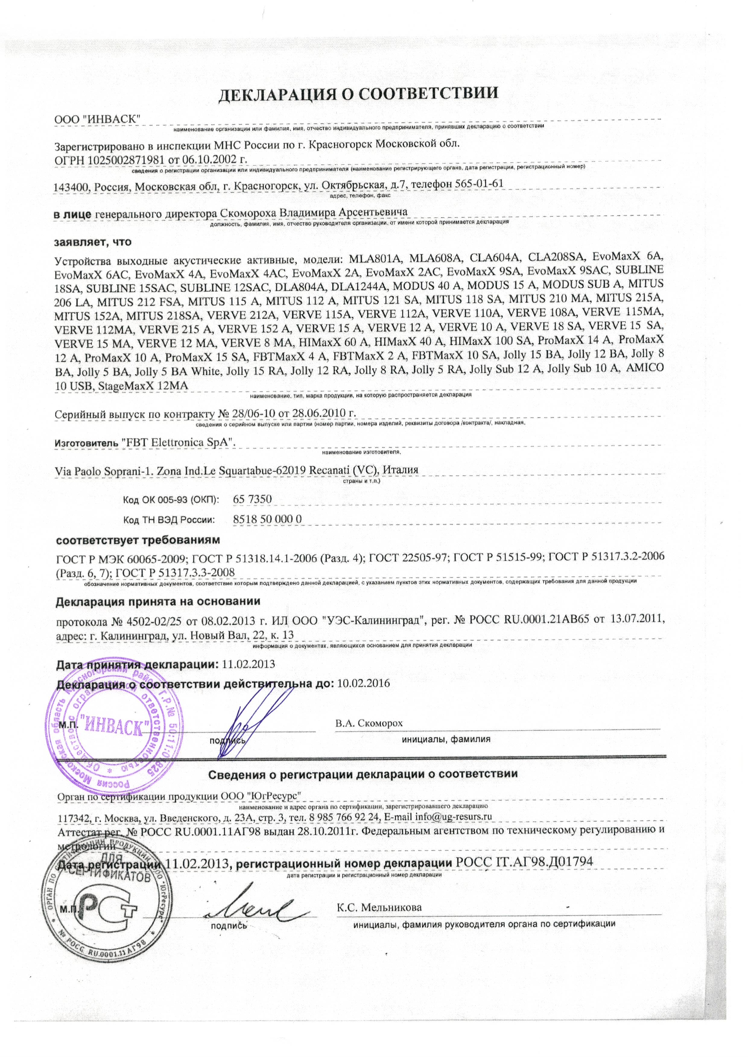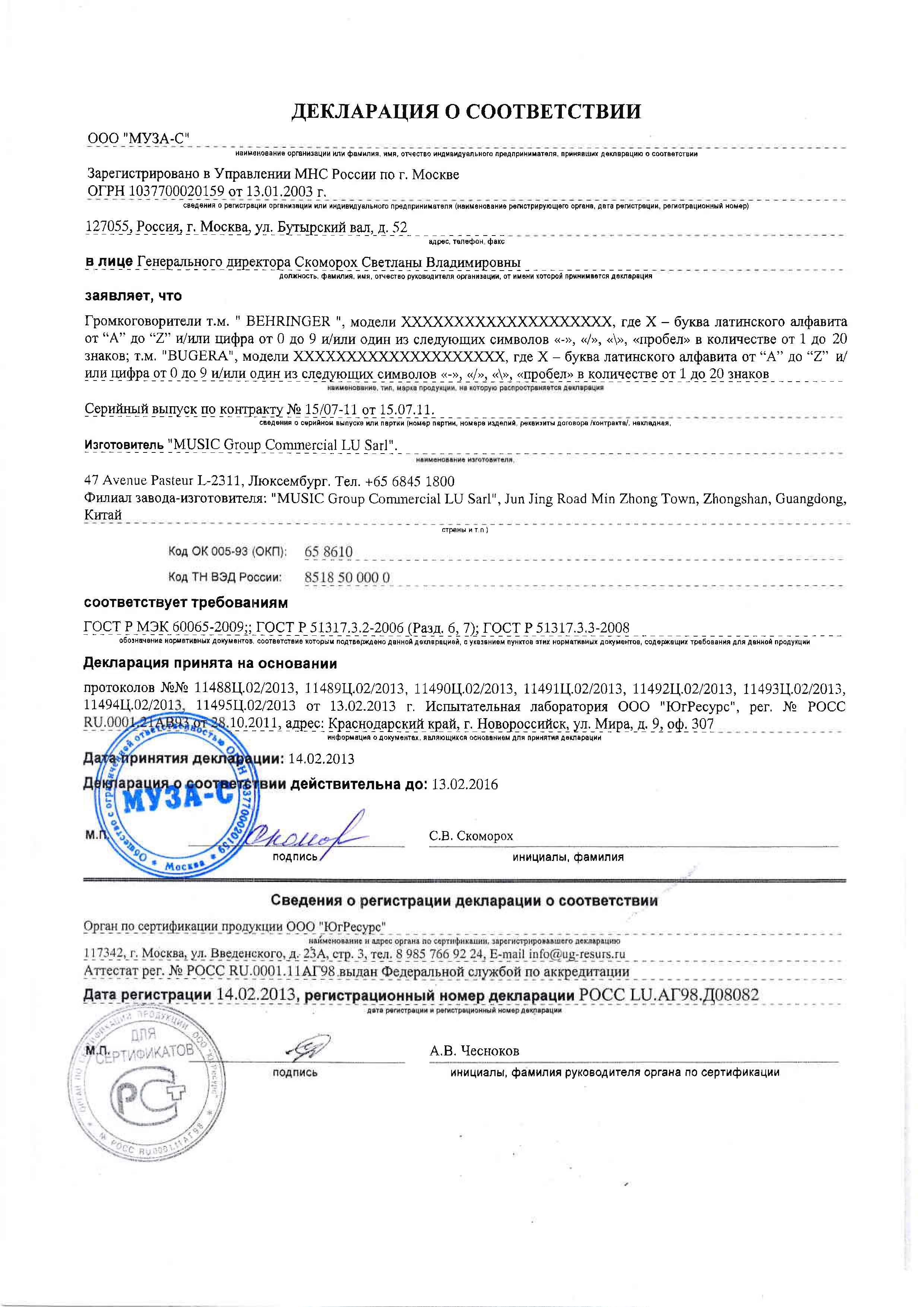 - Активные акустические системы. Декларация о соответствии (до 10.02.2016) (стр.1)