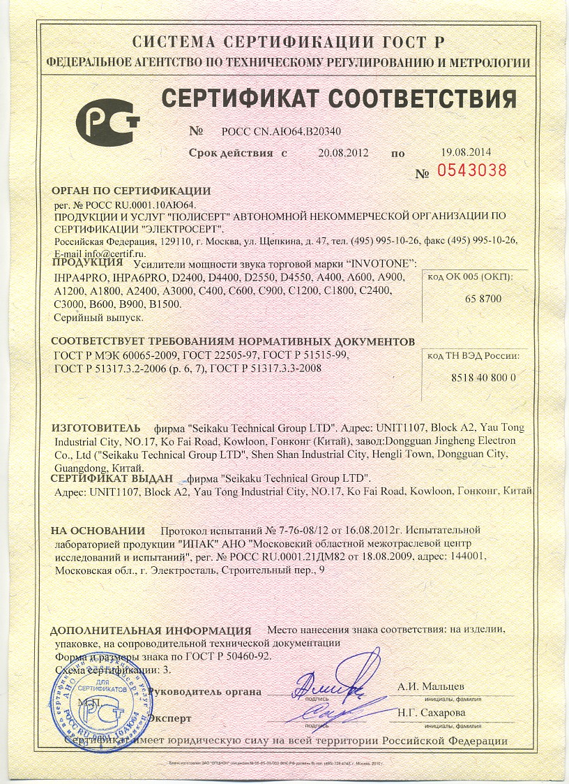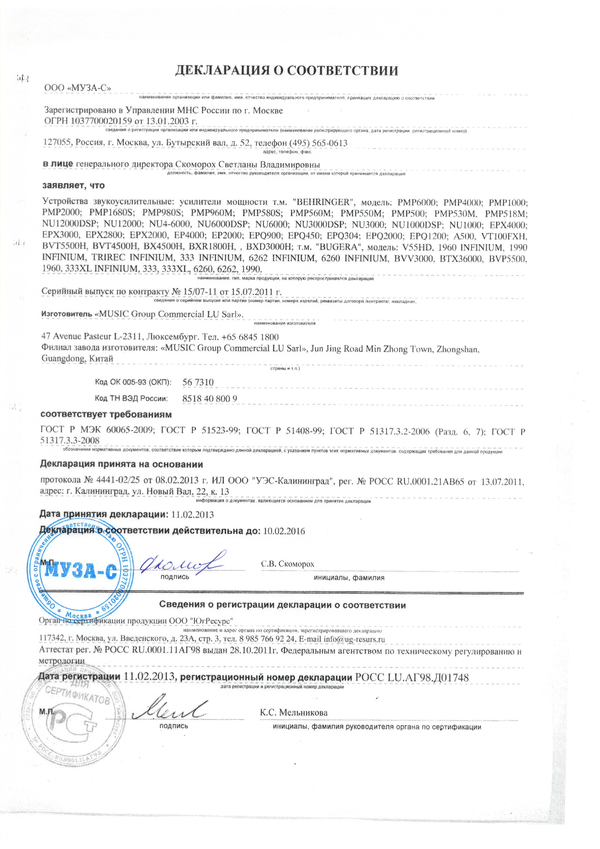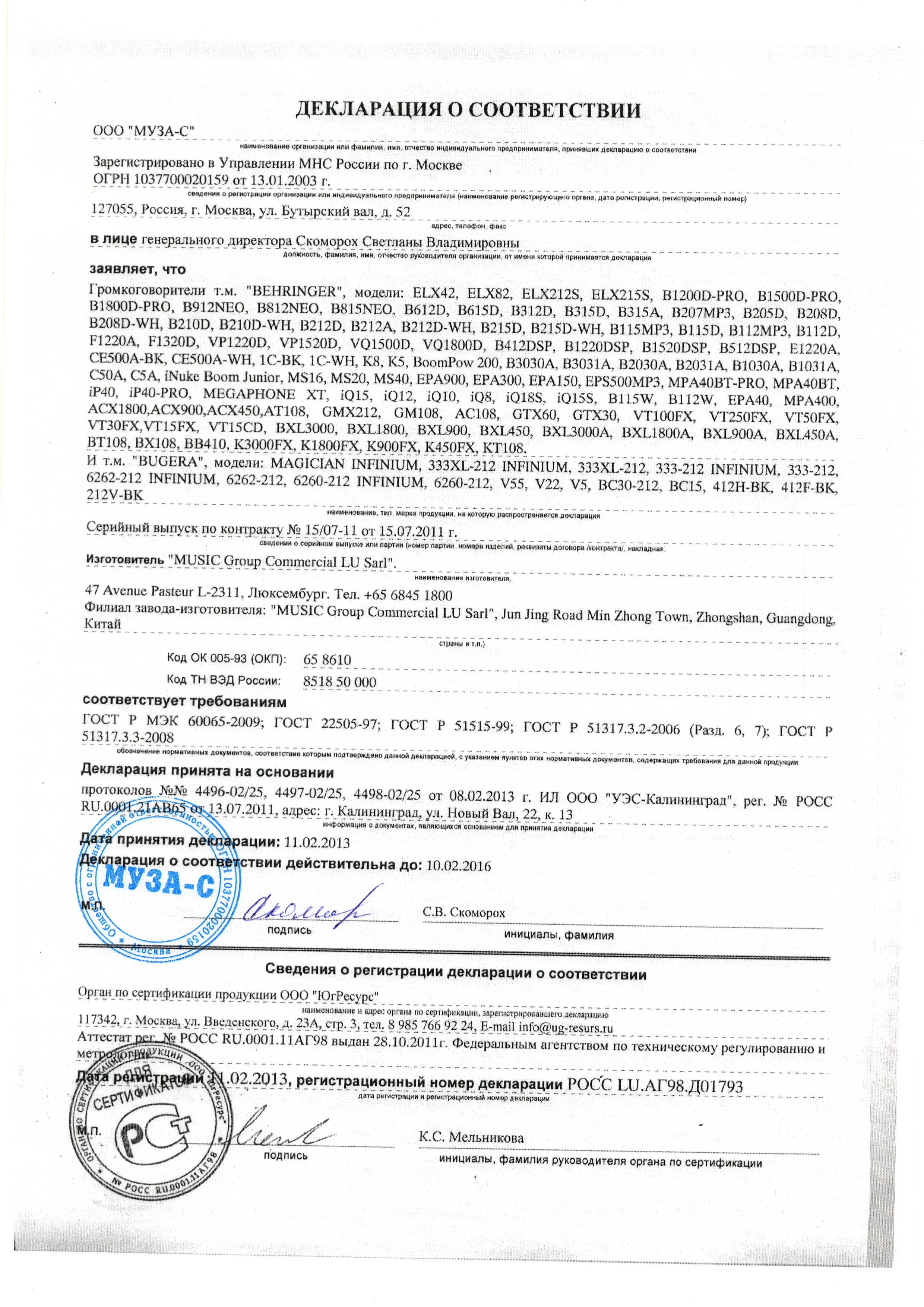 - Активные акустические системы. Декларация о соответствии (до 10.02.2016) (стр.1)