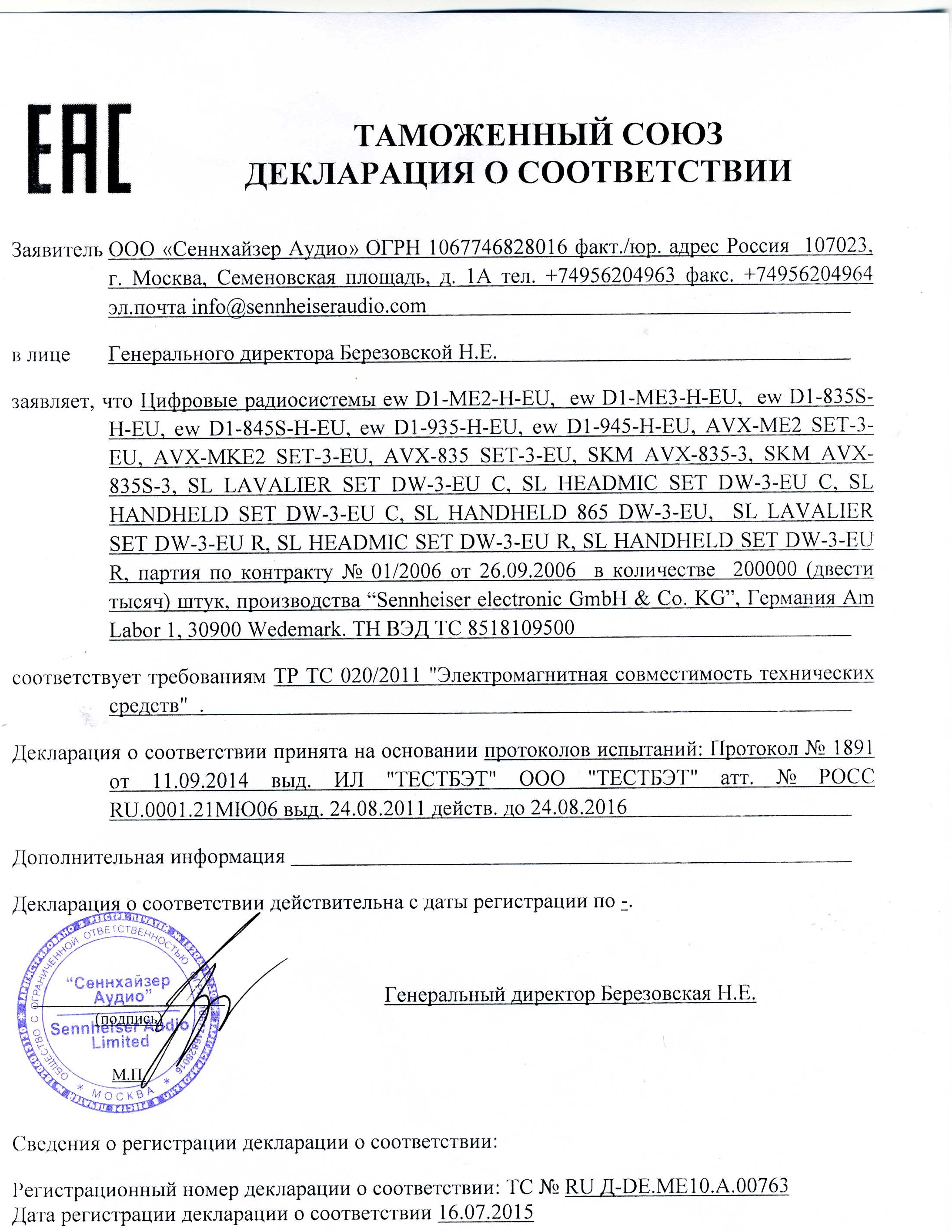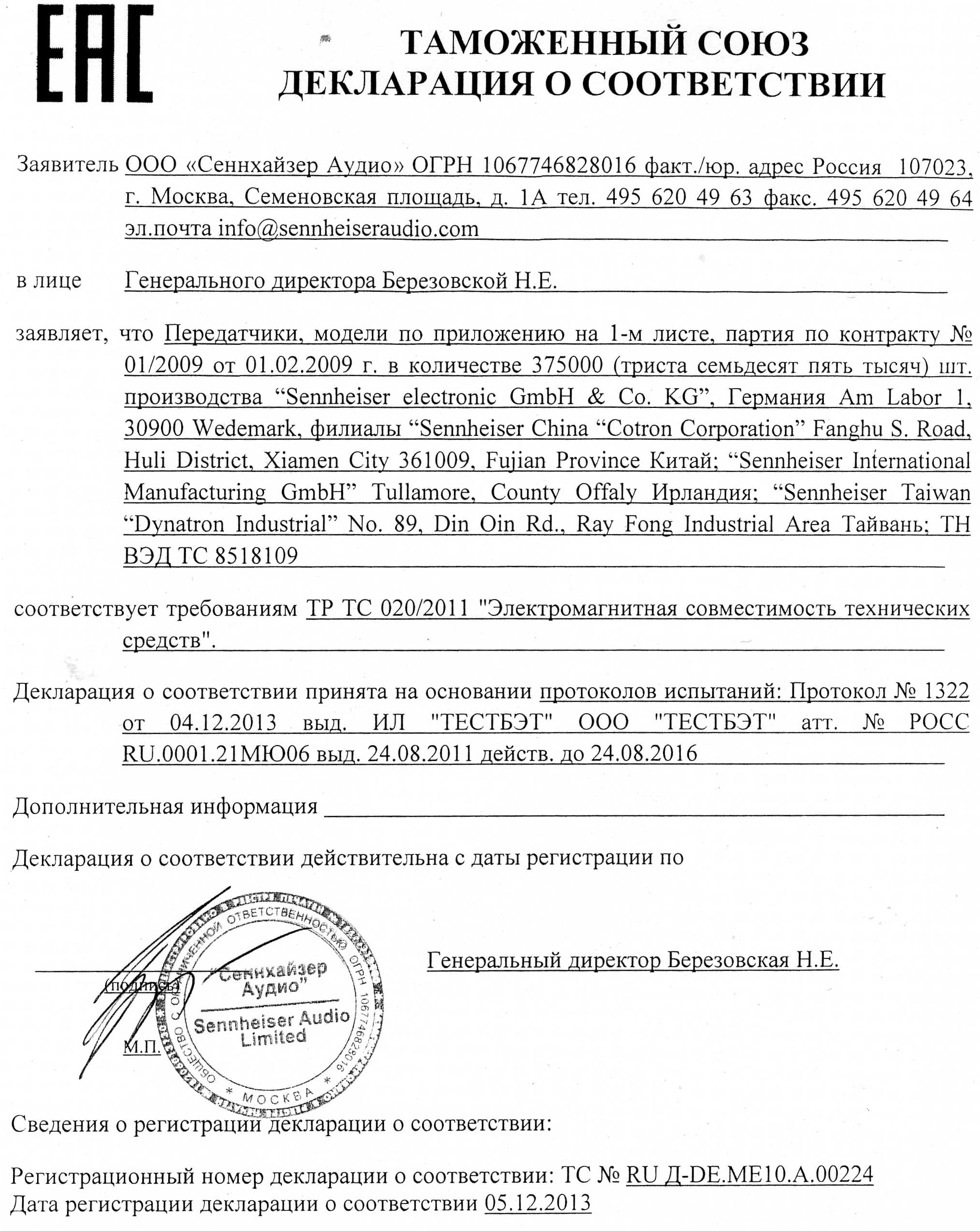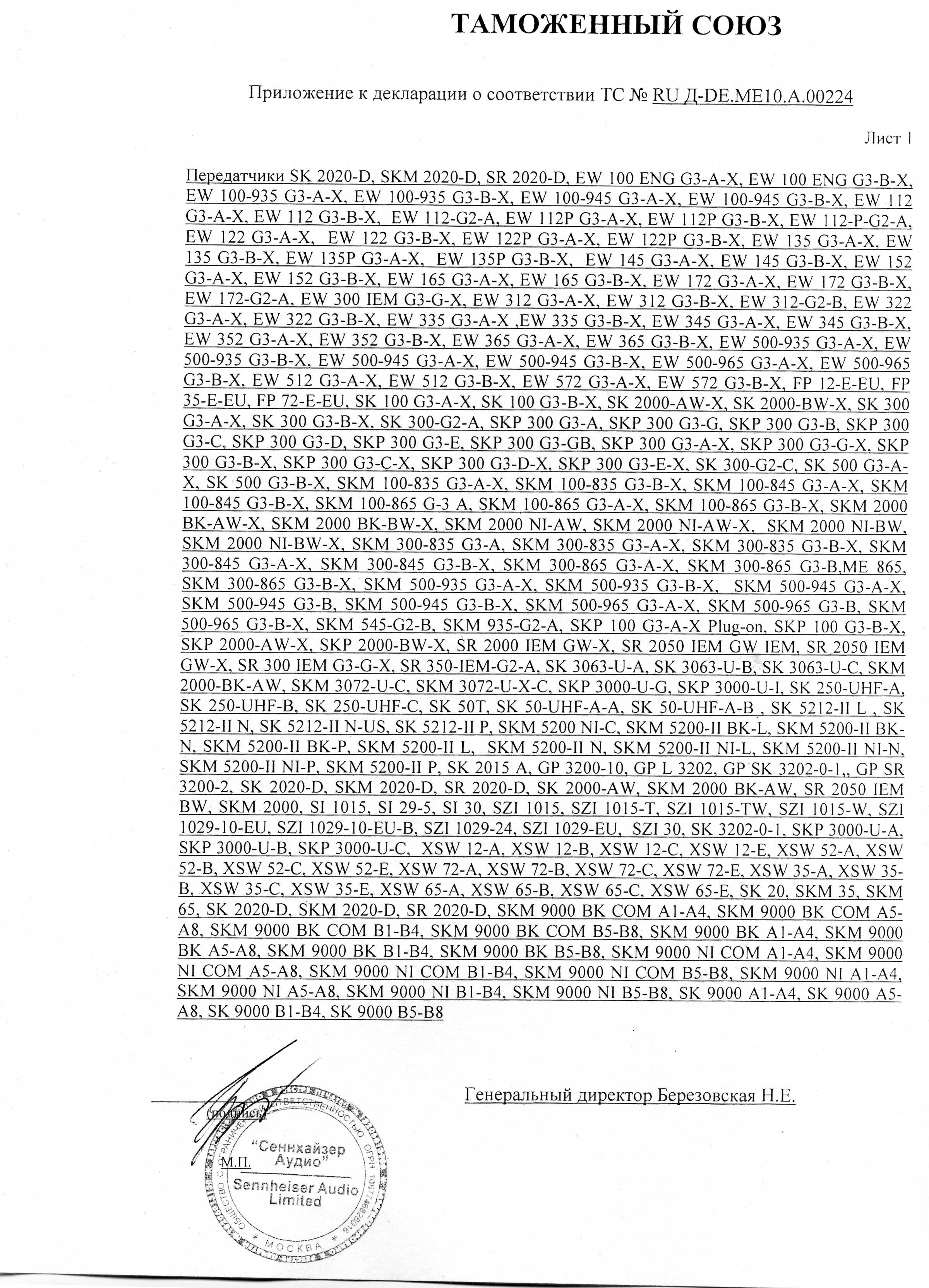 - Декларация соответствия на радиосистемы, приемники, передатчики, микрофоны и аксессуары к ним _____ EK, EM, EW, MKE, ME, SK, SKM, SKP, MKH, MZW, MZH, XSW, E, EAR, HSP и т.д. (до 11.02.2018 г.) (стр.1_____5)