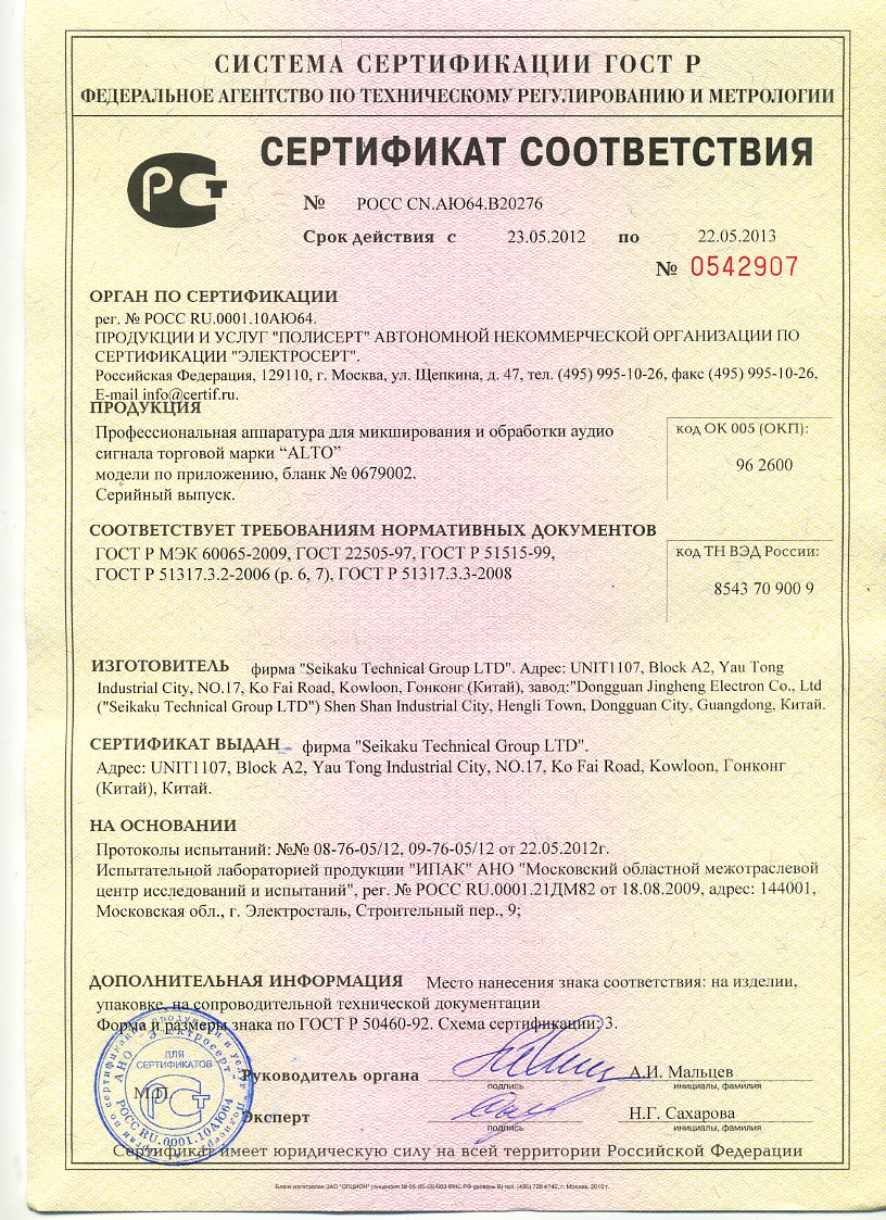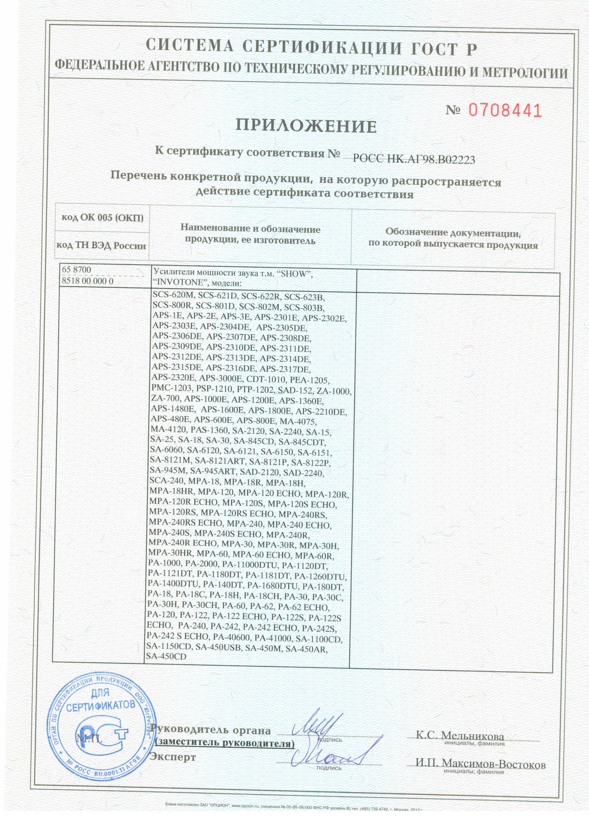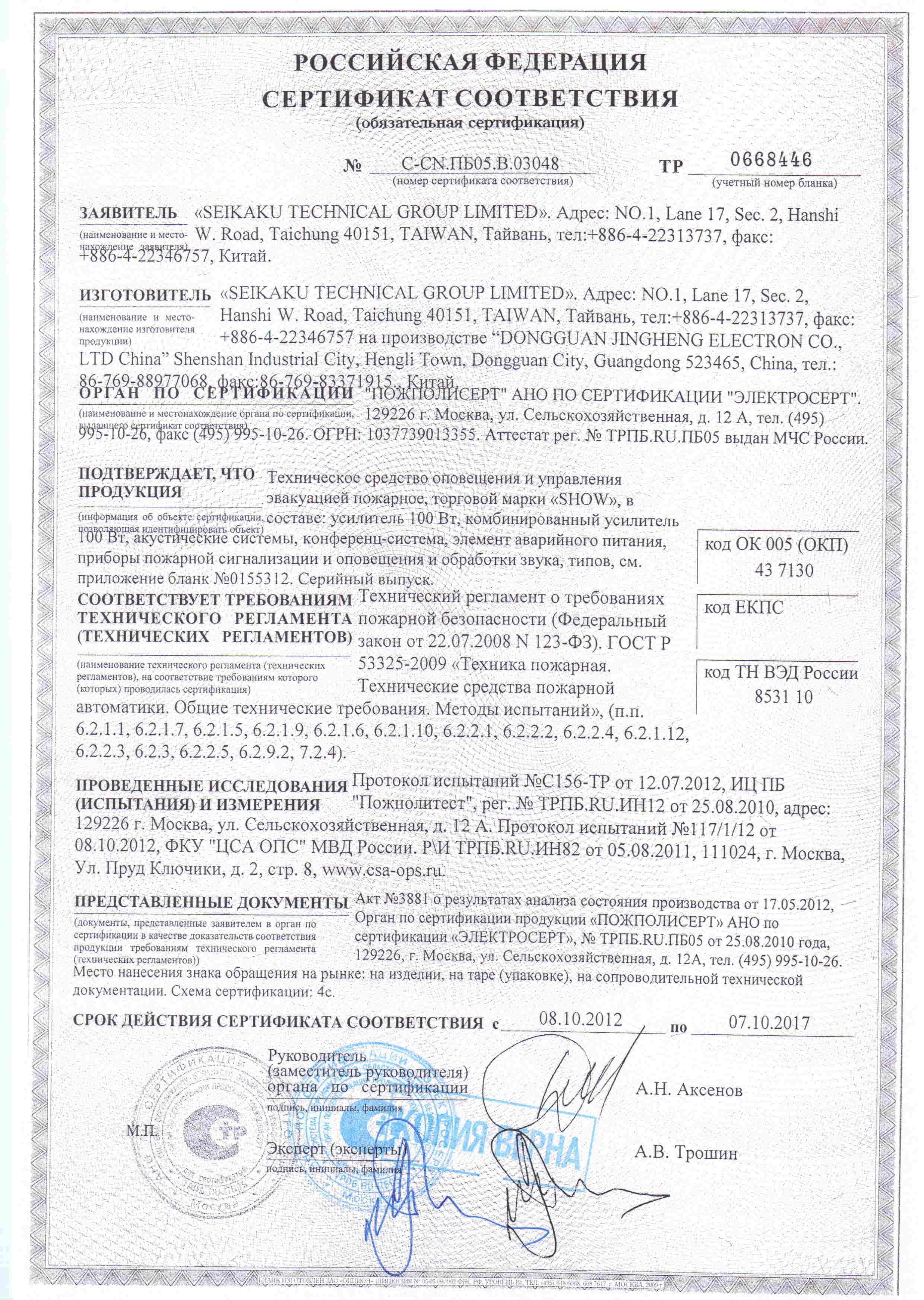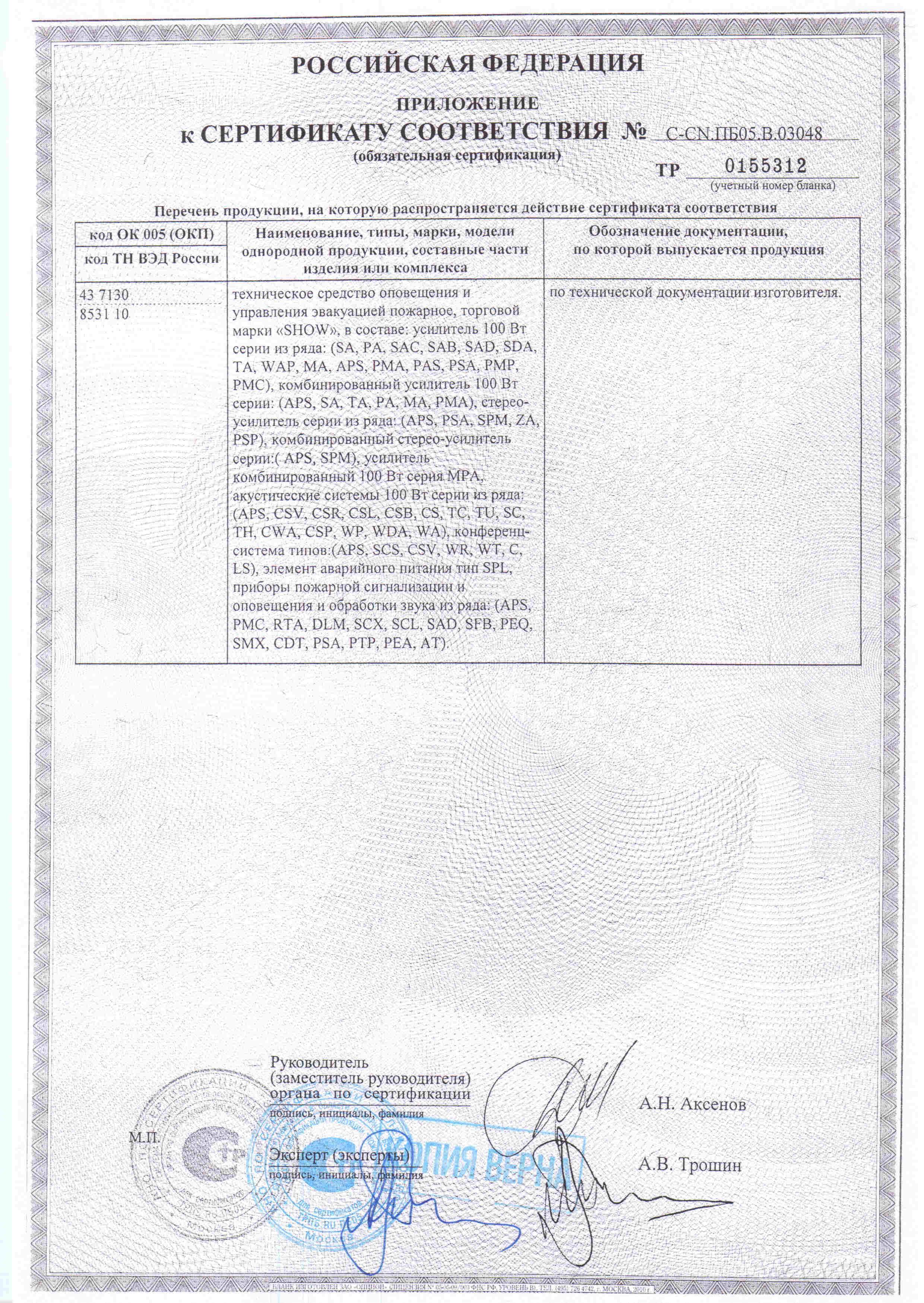 - Сертификат пожарной безопасности. Средства оповещения Show (комбин.усилители, конфер. системы, акуст.системы, приборы обработки звука _____ APS, SA, TA, TC и др.) (до 7.10.17) (стр.1) (стр.2)