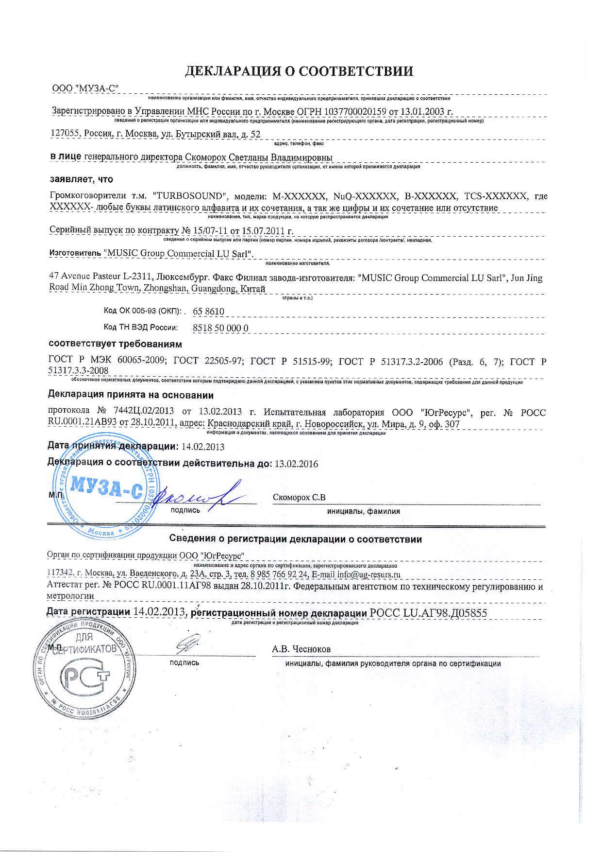 - Акустические системы. Декларация о соответствии (до 13.02.2016) (стр.1)
