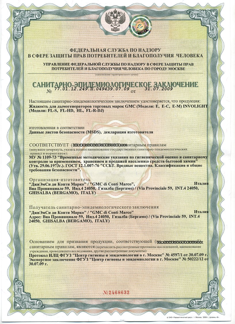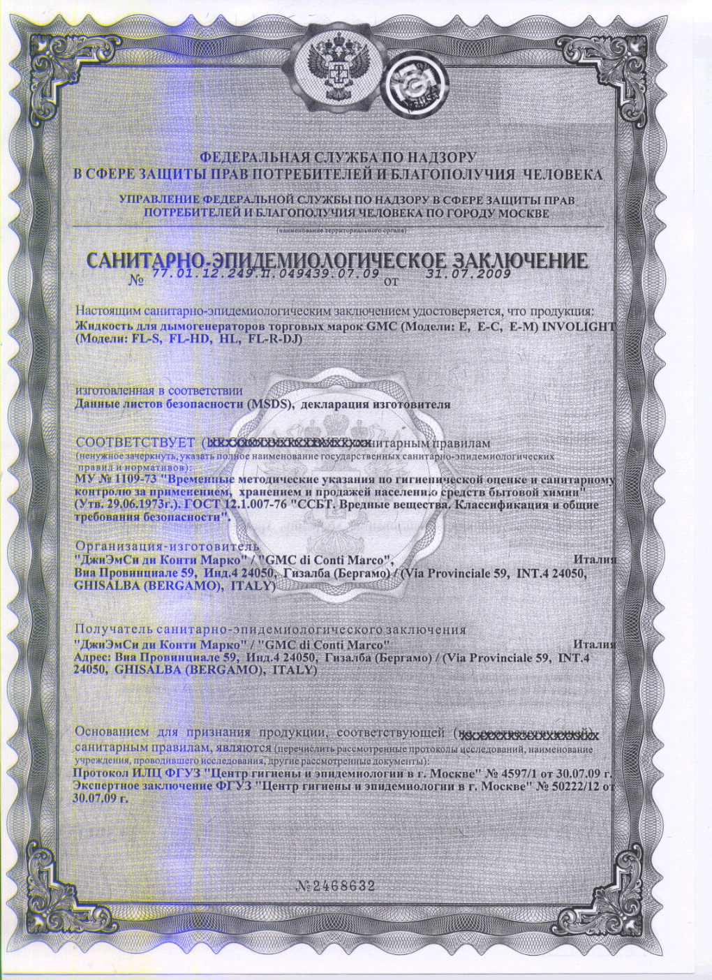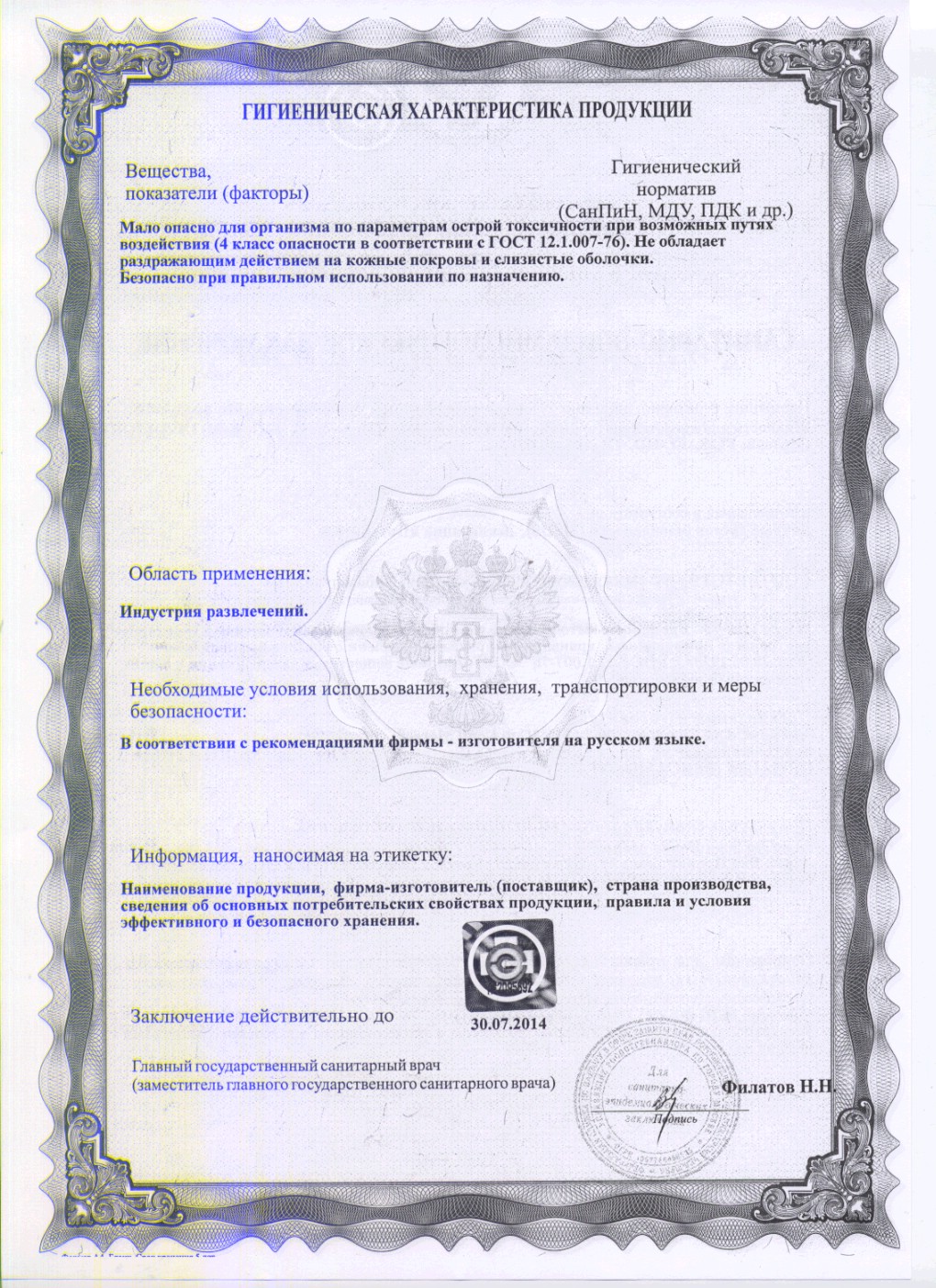 - Жидкость для дым генераторов. Санитарно_____эпидемиологическое заключение (30.07.14) (стр.1) (стр.2)